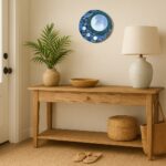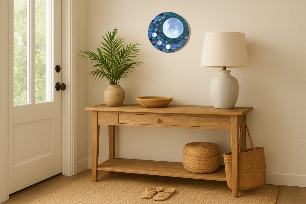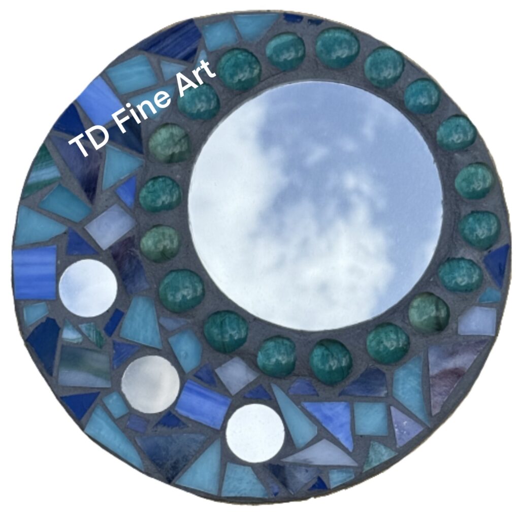 This handcrafted round mosaic mirror features blue and green cut glass tiles set against a soft gray background. A larger central mirror is accented by three smaller round mirrors, creating a unique design that catches light beautifully. Measuring 8½” in diameter, this colorful piece adds a touch of artistic sparkle to any wall—perfect for coastal, modern, or boho décor. Watermark is not added to the actual product. Pricing includes free domestic shipping in the United States. Please use the contact form to inquire about international shipping.