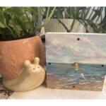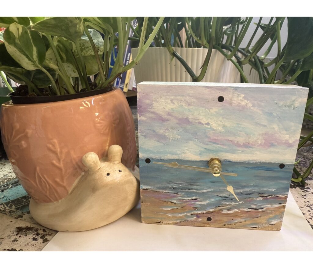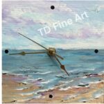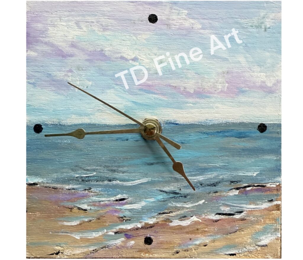 This custom-made 5″ x 5″ clock features a soft pastel acrylic seascape that wraps seamlessly around the sides, creating a gentle sense of depth and calm. With elegant gold hands and a serene coastal palette, it’s both functional and artful—perfect as a thoughtful gift or a subtle accent piece for any space. AA battery not included. Watermark is not added to the actual product. Pricing includes free domestic shipping in the United States. Please use the contact form to inquire about international shipping.