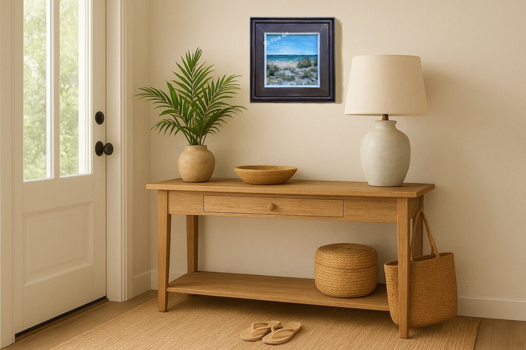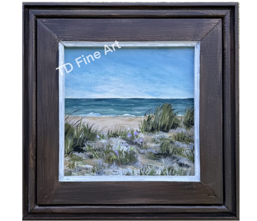 Coastal Ease Framed Seascape Was $170 Now $80 Sale“Coastal Ease” captures the gentle rhythm of the shoreline on a sunlit day. Breezes move through soft grasses and tiny purple blooms in the foreground, leading the eye toward the open beach and tranquil sea beyond. The colors are bright yet soothing, evoking the peace and vitality of the coast. Presented in a solid dark handcrafted wood frame, this acrylic canvas panel brings a sense of serenity and natural beauty to any space. 13″ x 13″. Watermark is not added to the actual product. . Pricing includes free domestic shipping in the United States. Please use the contact form to inquire about international shipping. Quantity Enter an amount $ Add to Cart Add to Cart You may also like Previous Next Sale Florida Sunset Oil Painting $375 Compare to $670 Sale Water Hazard Golf Acrylic Painting $325 Compare to $595 Sale Rhythm & Waves Surf Guitar Acrylic Painting $450 Compare to $830