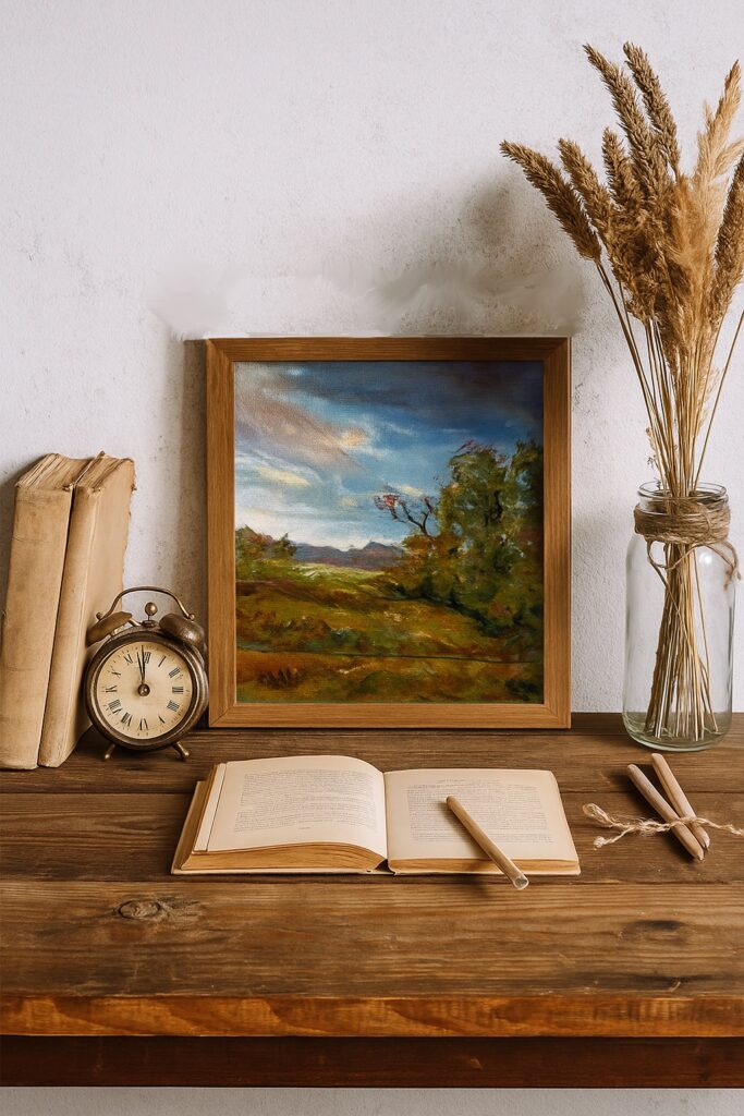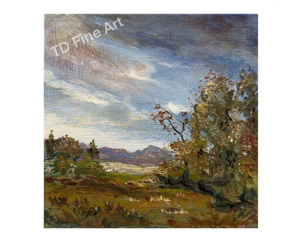 Country Breeze captures the quiet drama of an autumn day in the mountains. Dark clouds sweep across the sky with a sense of movement, while warm fall tones and distant peaks draw you in. This original 6″x6″ acrylic landscape is small yet inviting—perfect for adding a touch of country charm to any space. Ready for framing and full of atmosphere. Watermark is not added to the actual product. Frame is not included. Pricing includes free domestic shipping in the United States. Please use the contact form to inquire about international shipping.