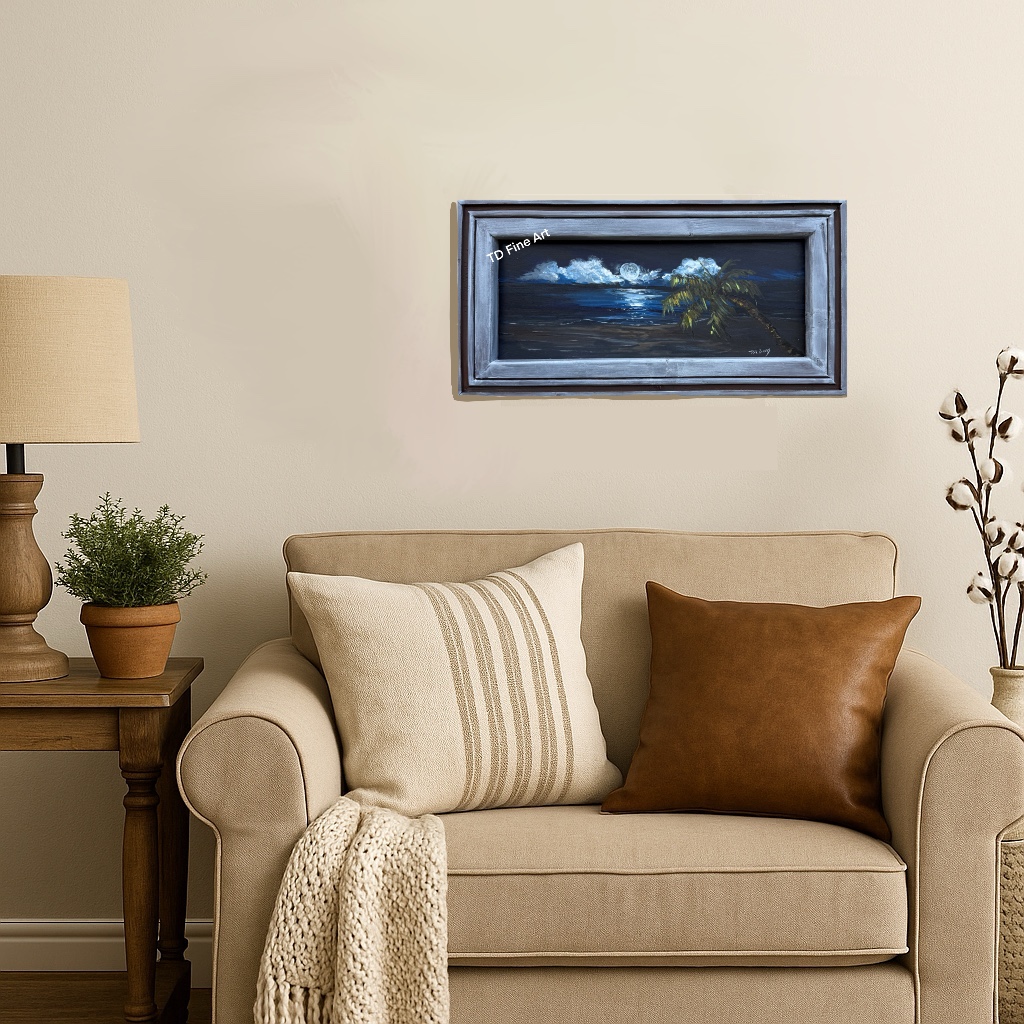 Evening Glow is a moody, coastal acrylic painting on a 15″x8″ hardboard panel. A dark seascape is illuminated by a full moon, creating a subtle and intriguing atmosphere. Handcrafted with a gray frame, this simplistic yet captivating piece brings coastal elegance and quiet drama to any wall. Perfect for modern, nautical, or moody décor. Watermark is not added to the actual product. Pricing includes free domestic shipping in the United States. Please use the contact form to inquire about international shipping.