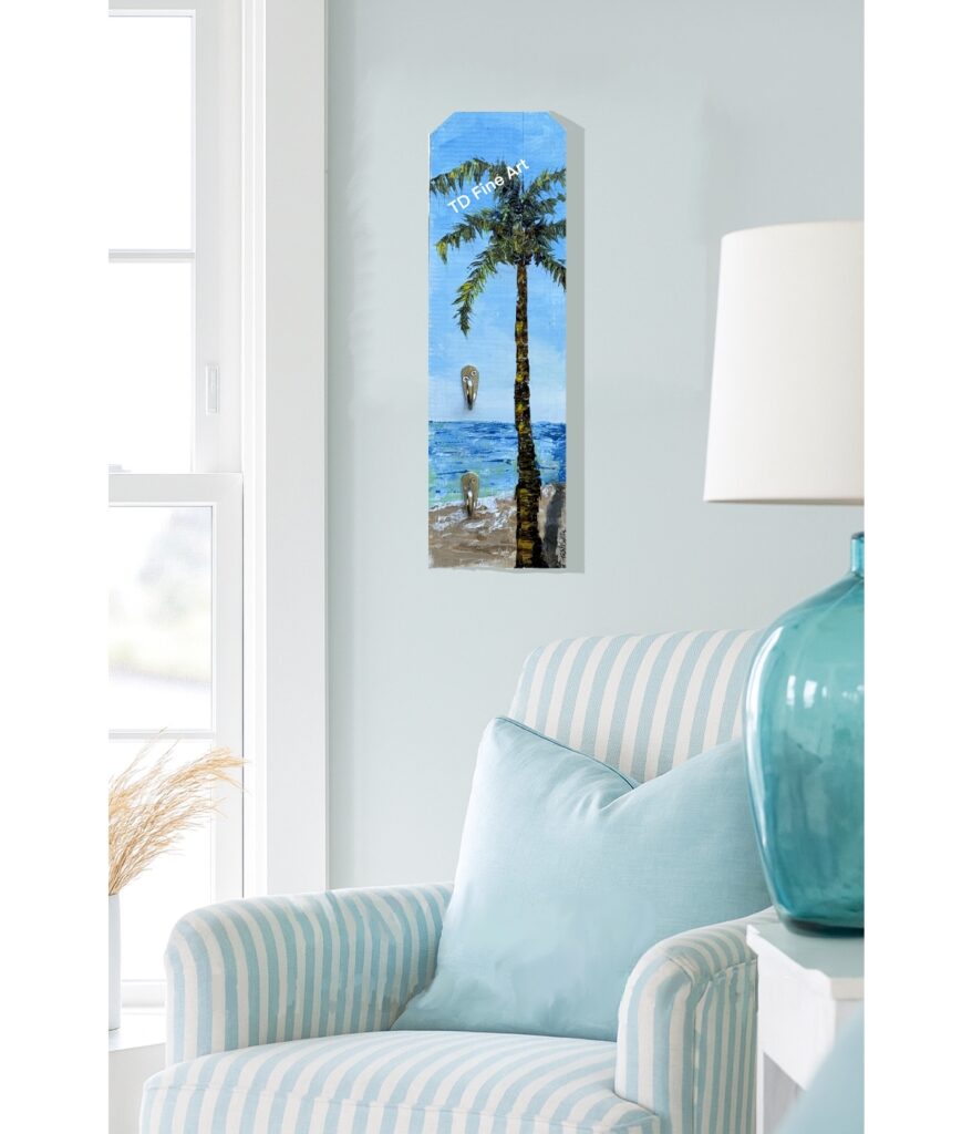 Bring a splash of coastal color to your entryway with this 18×6 wall organizer featuring a vibrant impressionistic palm. Hand-painted in bright, cheerful tones, this functional art piece includes two sturdy vertical hooks—perfect for holding keys, jackets, or a leash. Both practical and decorative, it adds a touch of tropical warmth and artistic charm to your home. Watermark is not added to the actual product. Pricing includes free domestic shipping in the United States. Please use the contact form to inquire about international shipping.