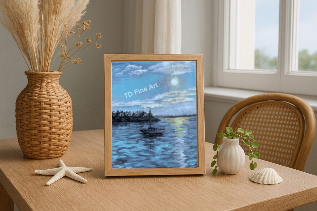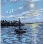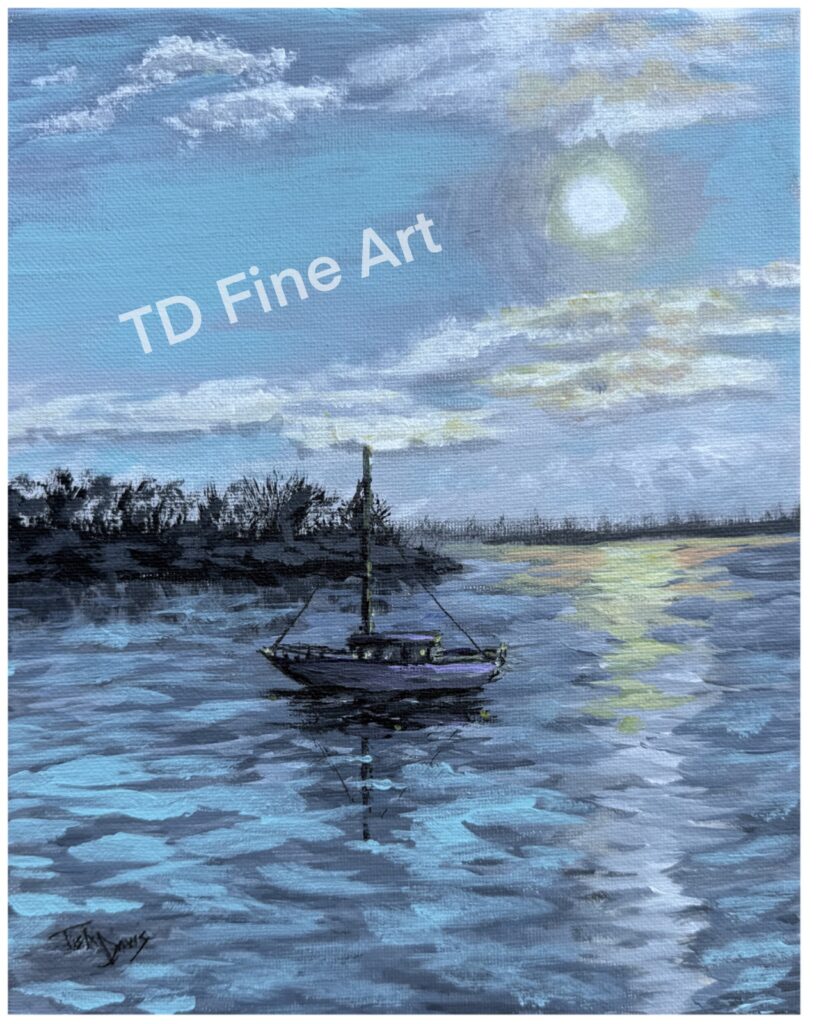 Mooring Seascape Was $80 Now $45 SaleMooring is an 8″x10″ acrylic painting on stretched canvas capturing the quiet beauty of a calm night at sea. Under the glow of a full moon, its reflection shimmers across the water where a lone sailboat rests near a shadowed island. Soft grays and light blues create a peaceful balance of light and contrast. Unframed, with a sawtooth hanger on the back for easy display. Watermark is not added to the actual product. Frame is not included. Pricing includes free domestic shipping in the United States. Please use the contact form to inquire about international shipping. Quantity Enter an amount $ Add to Cart Add to Cart You may also like Previous Next Sale Florida Sunset Oil Painting $375 Compare to $670 Sale Water Hazard Golf Acrylic Painting $325 Compare to $595 Sale Rhythm & Waves Surf Guitar Acrylic Painting $450 Compare to $830