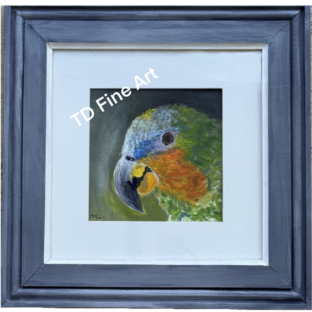 Pretty Parrot Acrylic Painting Was $225 Now $79 SalePretty Parrot captures the striking personality of a green parrot in rich, impressionistic color. Painted in acrylic on watercolor paper, the portrait focuses on the bird’s graceful profile—vivid yet refined, with subtle blending and expressive brushwork that bring him to life. Custom framed under glass in a handcrafted light gray solid wood frame with a white mat, this piece measures 15.5″ x 15.5″. A colorful, sophisticated statement for any space. Watermark is not added to the actual product. Pricing includes free domestic shipping in the United States. Please use the contact form to inquire about international shipping. Quantity Enter an amount $ Add to Cart Add to Cart You may also like Previous Next Sale Florida Sunset Oil Painting $375 Compare to $670 Sale Water Hazard Golf Acrylic Painting $325 Compare to $595 Sale Rhythm & Waves Surf Guitar Acrylic Painting $450 Compare to $830