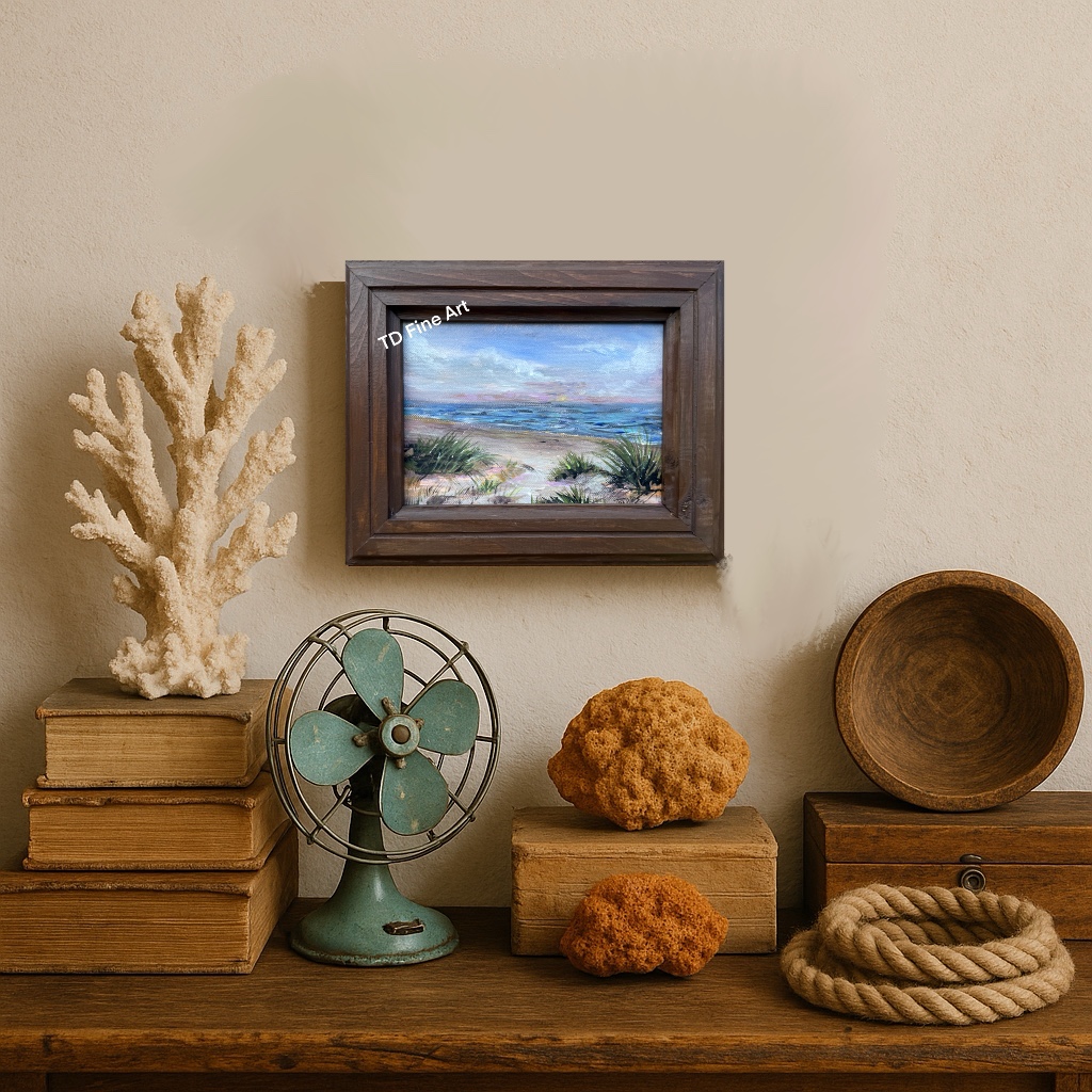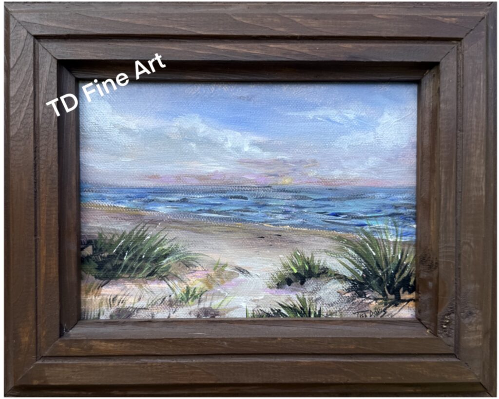 Serenity Seascape Was $85 Now $63 SaleSerenity is a tranquil acrylic seascape painted on a canvas panel, capturing the gentle rhythm of waves and drifting clouds along the coast. Grasses in the foreground sway with the breeze, while soft pink undertones signal the approach of sunset, highlighted with subtle accents of light. Custom framed in a rich, warm chocolate-hued wood, this piece evokes calm, coastal beauty and is ready to display. 10″ x 8.5″. Watermark is not added to the actual product. Pricing includes free domestic shipping in the United States. Please use the contact form to inquire about international shipping. Quantity Enter an amount $ Add to Cart Add to Cart You may also like Previous Next Sale Florida Sunset Oil Painting $375 Compare to $670 Sale Water Hazard Golf Acrylic Painting $325 Compare to $595 Sale Rhythm & Waves Surf Guitar Acrylic Painting $450 Compare to $830