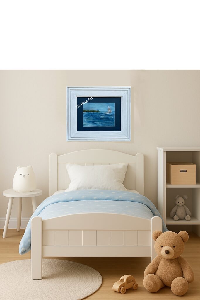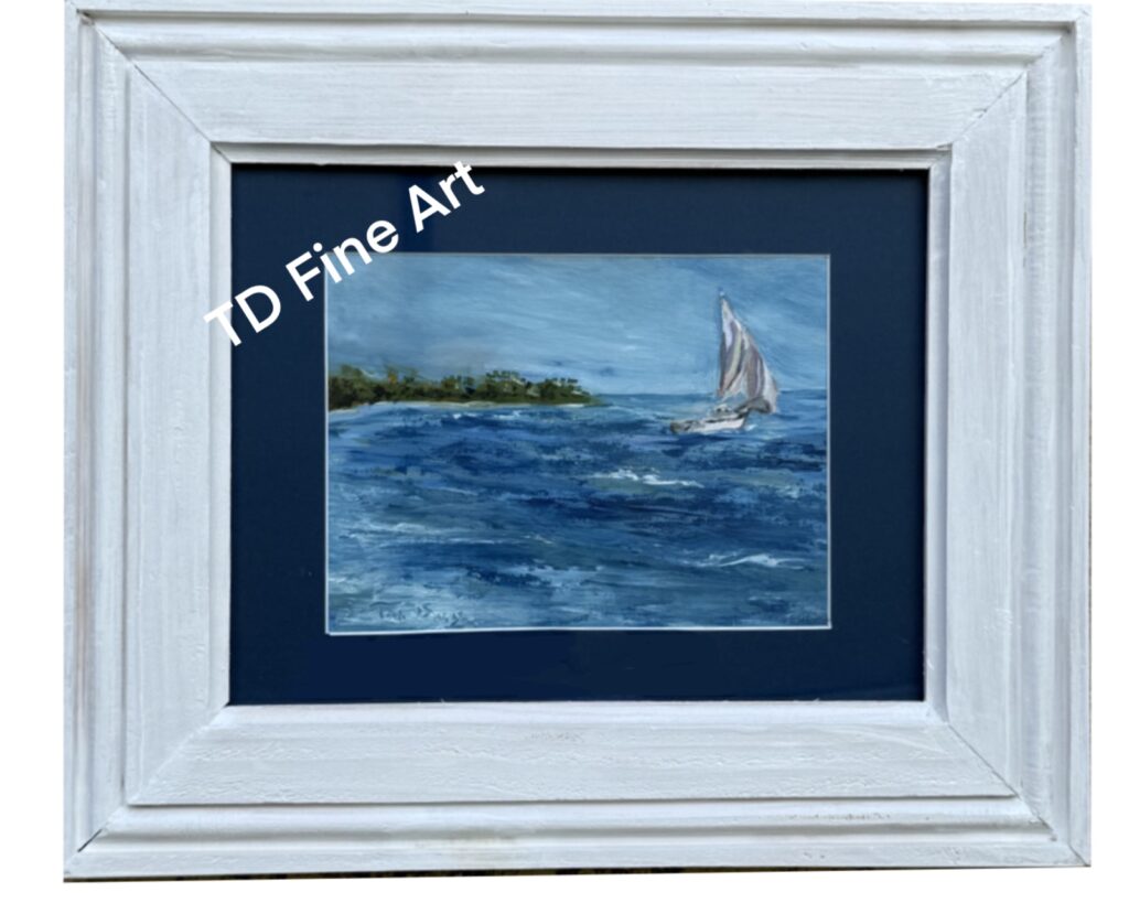Setting Sail Seascape Was $201 Now $89 SaleSetting Sail is an impressionistic oil seascape alive with motion and atmosphere. Shades of blue capture the rhythmic movement of the sea as a lone sailboat drifts from the inlet beneath soft, shifting clouds. Presented on a canvas panel and beautifully custom-framed with a white solid wood frame and navy mat under glass, this piece measures 15.5″ x 13″ overall. Elegant and timeless, it brings a calm coastal presence to any room. Watermark is not added to the actual product. Pricing includes free domestic shipping in the United States. Please use the contact form to inquire about international shipping. Quantity Enter an amount $ Add to Cart Add to Cart You may also like Previous Next Sale Florida Sunset Oil Painting $375 Compare to $670 Sale Water Hazard Golf Acrylic Painting $325 Compare to $595 Sale Rhythm & Waves Surf Guitar Acrylic Painting $450 Compare to $830