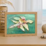 Twin Orchids features two graceful orchids, one perched atop the other, painted in soft, blended pastel tones against a soothing green background. Bright yet calming, this 8″ x 10″ oil painting evokes elegance and serenity. Ready for framing, it makes a beautiful accent piece or thoughtful gift for any plant or floral art lover. Watermark is not added to the actual product. Frame is not included. Pricing includes free domestic shipping in the United States. Please use the contact form to inquire about international shipping.