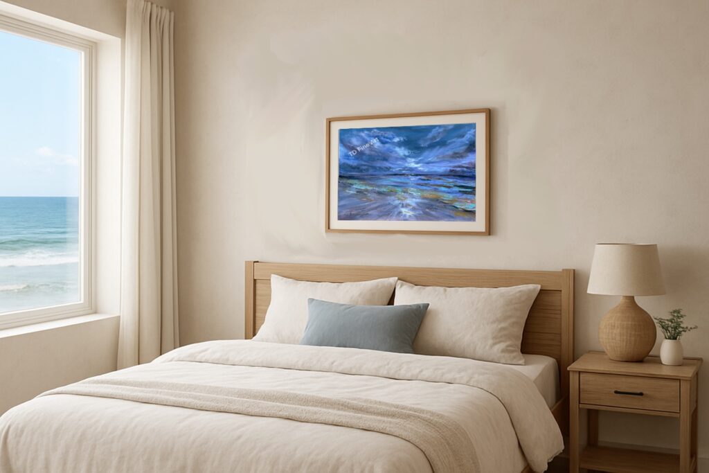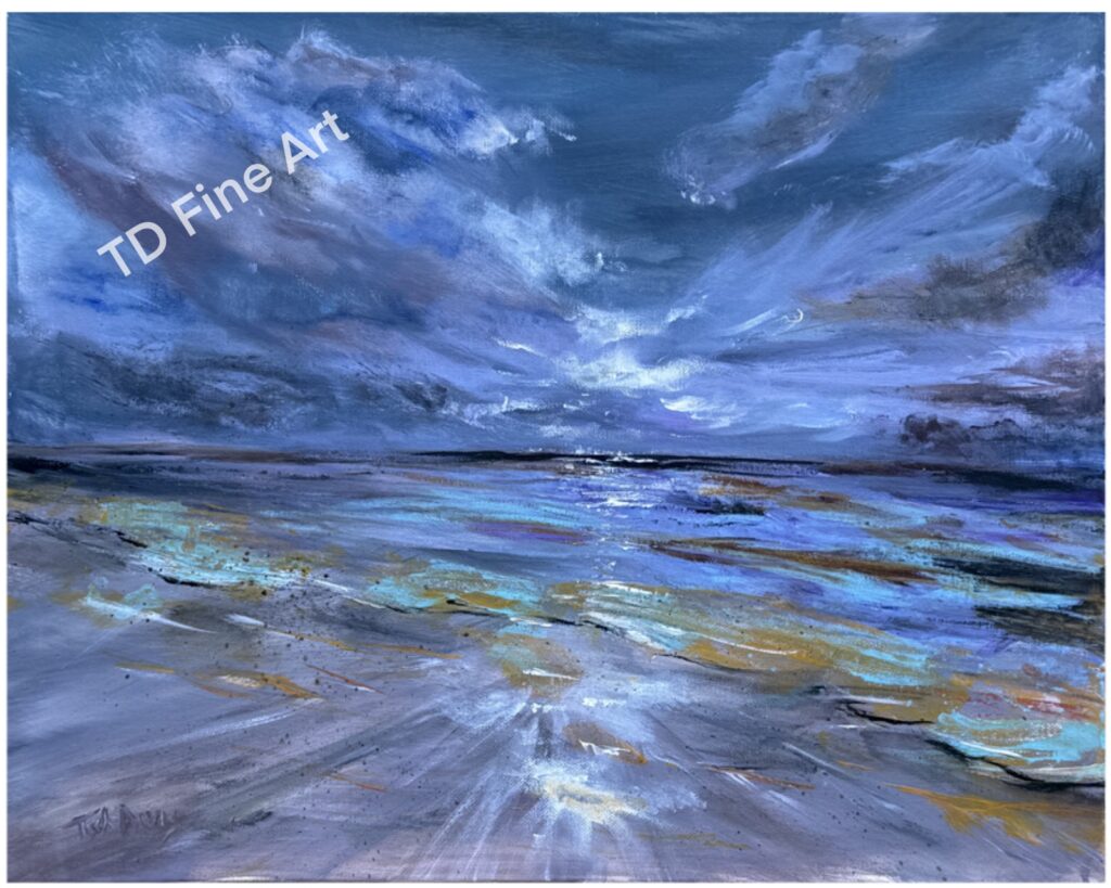 “Vibrancy” accurately describes this seascape painting. Loaded with color, the clouds seem to be moving yet there is a calm upon the water as if a storm has just passed. This acrylic painting is 16″ x  20″ on stretched canvas. It’s ready for framing, but there is a sawtooth hook on back for easy hanging. This piece is an attention grabber and would look nice in a coastal living room.  Watermark is not added to the actual product. Frame is not included. Pricing includes free domestic shipping in the United States. Please use the contact form to inquire about international shipping.